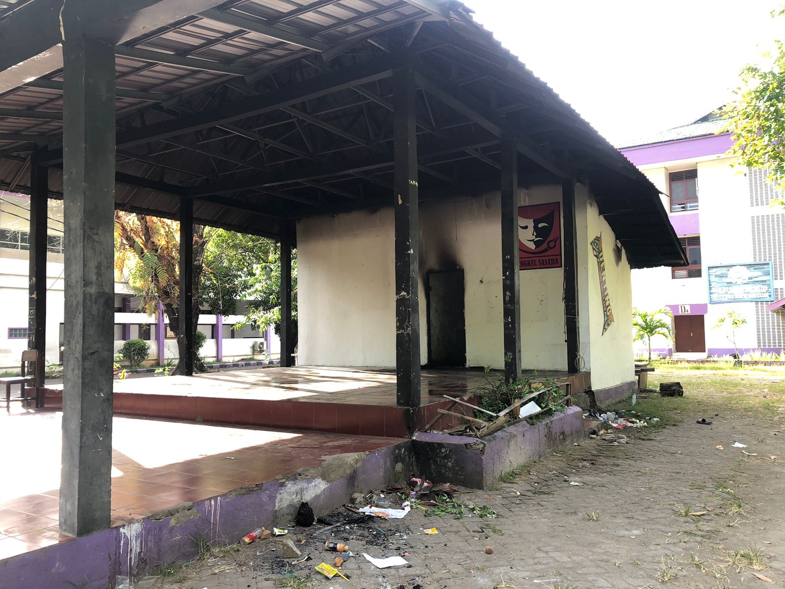 Suasana kerusakan Sekretariat Bengkel Sastra akibat penyerangan di FBS UNM, Minggu (4/6). Foto: Nurul Dwi Anugrah/Estetikapers.