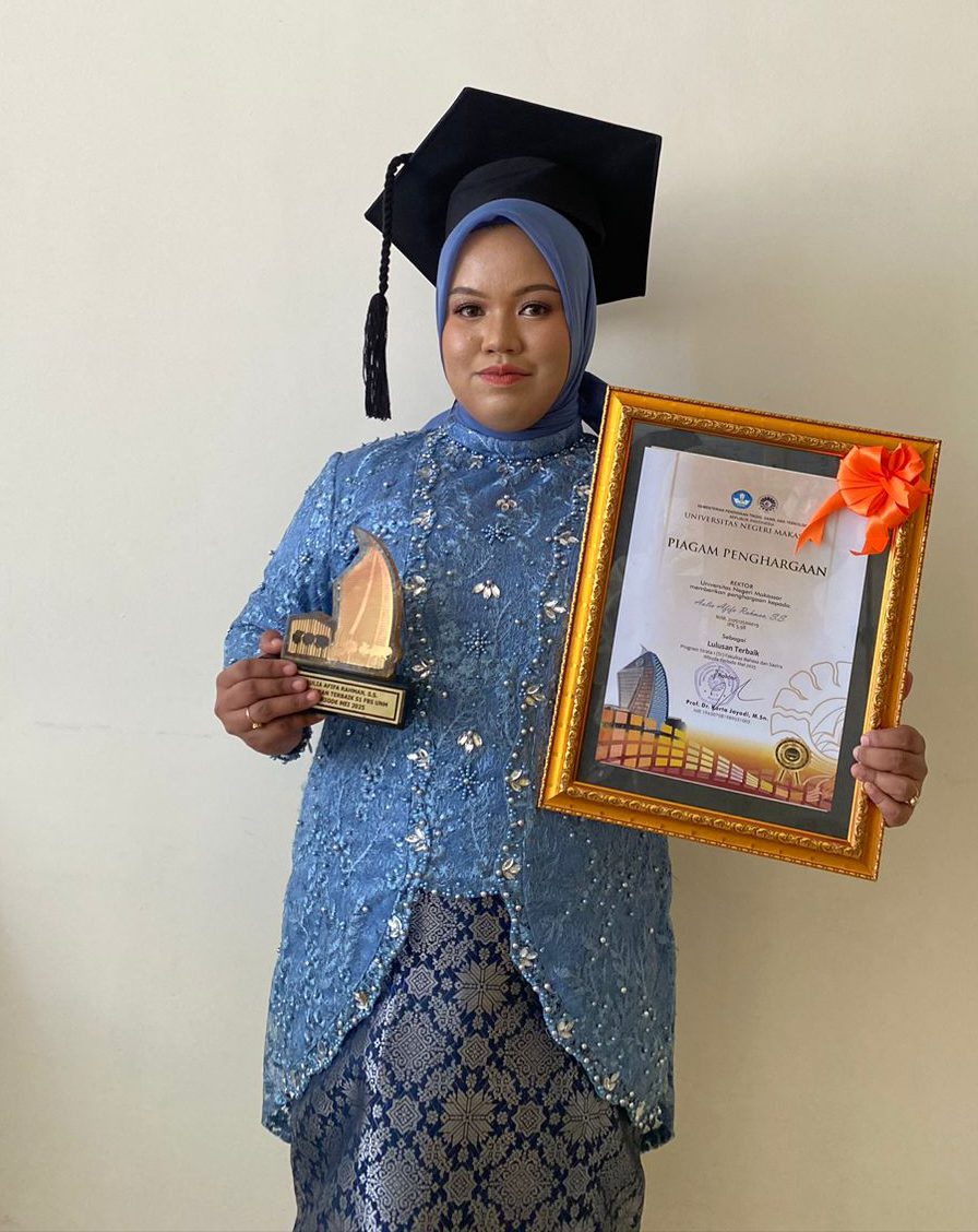 Makassar, Estetika – Aulia Afifa Rahman meraih predikat Wisudawan Terbaik Fakultas Bahasa dan Sastra (FBS) Universitas Negeri Makassar (UNM) pada wisuda periode Mei 2025 di Pelataran Pinisi UNM, Rabu (28/5).