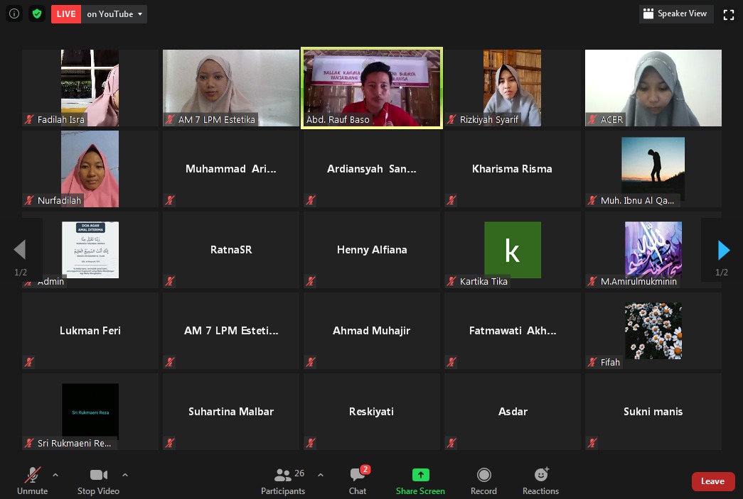 Makassar, Estetika – Himpunan Mahasiswa Program Studi (HMPS) Pendidikan Bahasa dan Sastra Daerah (PBSD) Jurusan Bahasa dan Sastra Indonesia (JBSI) Fakultas Bahasa dan Satra (FBS) Universitas Negeri Makassar (UNM) mengadakan Bincang Budaya dalam PBSD Kajian Rutin Intelektual dan Religiusitas (Kritis) via Zoom App & Live Youtube, Minggu (30/8).