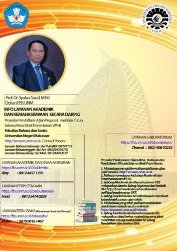 Makassar, Estetika – Dekan Fakultas Bahasa dan Sastra (FBS) Universitas Negeri Makassar (UNM), Syukur Saud, menyediakan Info Layanan Akademik dan Kemahasiswaan selama masa work from home (WFH) atau secara daring, Jumat (8/1).