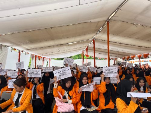 Makassar, Estetika – Badan Eksekutif Mahasiswa (BEM) Universitas Negeri Makassar (UNM) menggelar Aksi Internal tepat pada pelaksanaan PKKMB tingkat universitas di Pelataran Gedung Pinisi UNM, Senin (11/8).