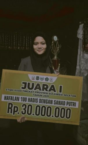 “Proses yang saya lalui sehingga terpilih menjadi perwakilan Sulsel dimulai saat saya terpilih mewakili Kabupaten Sidrap dalam cabang lomba hafalan 100 hadis dengan sanad putri, bahkan saat itu saya sempat merasa tertekan, namun berkat dukungan teman dan guru saya, akhirnya saya dapat melalui itu semua,” jelasnya.
