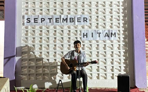Makassar, Estetika – Penampilan Lagu dan Puisi oleh Muhammad Sagih Fajrian dari Campus Syndicate 1915 turut meriahkan Panggung Ekspresi “September Hitam” Badan Eksekutif Mahasiswa (BEM) Fakultas Bahasa dan Sastra (FBS) Universitas Negeri Makassar (UNM) di Depan Gedung DG 106 FBS, Selasa (30/9).