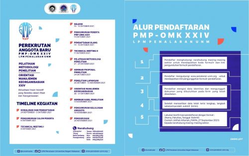 Rilis, Estetika – Lembaga Penelitian Mahasiswa (LPM) Penalaran Universitas Negeri Makassar (UNM) mengadakan Sosialisasi Pelatihan Metodologi Penelitian dan Orientasi Manajemen Keorganisasian XXIV (PMP-OMK) di 9 fakultas UNM secara daring, Jumat (24/9).