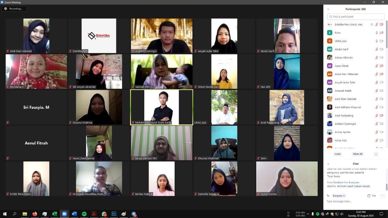 Makassar, Estetika – Aziz selaku Wakil Dekan Bidang Kemahasiswaan (WD III) Fakultas Bahasa dan Sastra (FBS) Universitas Negeri Makassar (UNM) resmi membuka Pendidikan dan Pelatihan Jurnalistik Mahasiswa Tingkat Dasar (PPJMTD) 2020 via Zoom, Minggu (3/8).