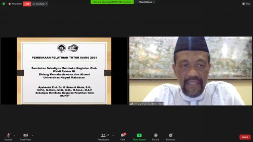 Makassar, Estetika – Wakil Rektor Bidang Kemahasiswaan dan Alumni (WR III) Universitas Negeri Makassar (UNM) resmi membuka Pelatihan Tutor Studi Al-Qur’an Intensif (Sains) yang dilaksanakan oleh Badan Pelaksana Sains (BPS) UNM via Zoom dan YouTube, Sabtu (31/7).