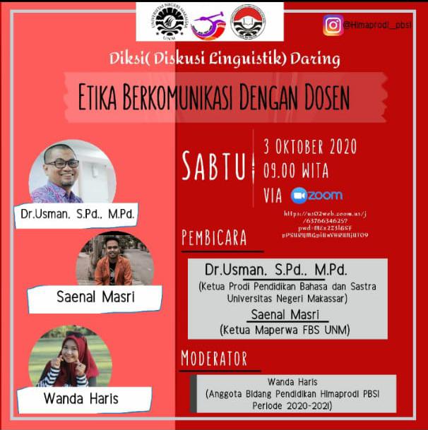 Makassar, Estetika – Himpunan Mahasiswa Program Studi (Himaprodi) Pendidikan Bahasa dan Sastra Indonesia (PBSI) Dewan Mahasiswa (DEMA) Jurusan Bahasa dan Sastra Indonesia (JBSI) Fakultas Bahasa dan Sastra (FBS) Universitas Negeri Makassar (UNM) mengadakan Diskusi Linguistik (Diksi) mengenai Etika Berkomunikasi Dengan Dosen via daring, Makassar (3/10)….